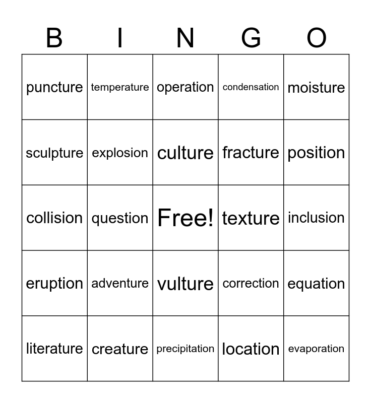 This bingo card has a free space and 24 words: adventure, creature, culture, literature, moisture, puncture, sculpture, temperature, texture, vulture, fracture, collision, correction, equation, explosion, location, inclusion, operation, position, question, evaporation, eruption, condensation and precipitation.