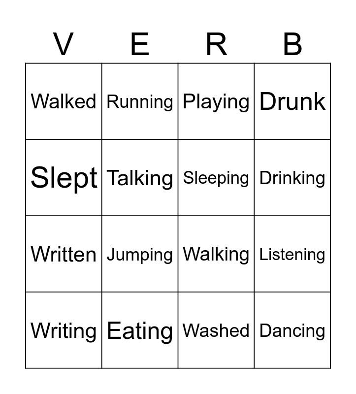 This bingo card has 16 words: Eating, Listening, Playing, Walked, Written, Running, Walking, Washed, Slept, Talking, Writing, Drunk, Jumping, Drinking, Sleeping and Dancing.
