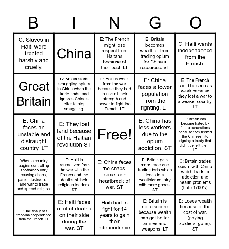 This bingo card has a free space and 24 words: E: Haiti is traumatized from the war with the French and the deaths of their religious leaders. ST, E: Haiti faces a lot of deaths on their side during the war. ST, E: Haiti is weak from the war because they had to use all their strength and power to fight the French. LT, E: Haiti finally has freedom/independence from the French. LT, C: Haiti wants independence from the French., C: Slaves in Haiti were treated harshly and cruelly., Great Britain, China, E: China has less workers due to the opium addiction. ST, E: China faces the chaos, panic, and heartbreak of war. ST, E: China faces a lower population from the fighting. LT, E: China faces an unstable and distraught country. LT, E: Britain gets more trade one trading forts which leads to a wealthier country with more goods. ST, C: Britain trades opium with China which leads to addiction and health problems (Late 1700’s)., C: Britain starts smuggling opium in China when the trade ends, and ignores China’s letter to stop smuggling., E: Britain is more secure because wealth can get better armies and weapons. LT, E: Britain can become hated by future generations because they tricked the Chinese into signing a treaty that didn’t benefit them. LT, E: The French might lose respect from Haitans because of their past. LT, E: The French could be seen as weak because they lost a war to a weaker country. LT, E: They lost land because of the Haitian revolution ST, E: Loses wealth because of the cost of war.(paying soldiers, guns). ST, When a country begins controlling another country causing chaos, panic, destruction, and war to trade and spread religion., E: Britain becomes wealthier from trading opium for China’s resources. ST and Haiti had to fight for 14 years to gain their independence..