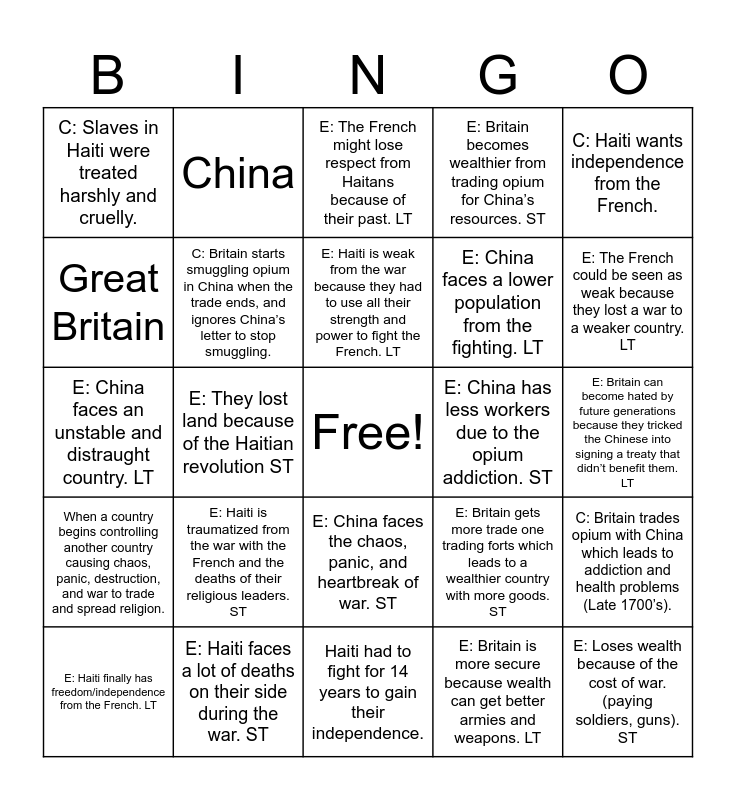 This bingo card has a free space and 24 words: E: Haiti is traumatized from the war with the French and the deaths of their religious leaders. ST, E: Haiti faces a lot of deaths on their side during the war. ST, E: Haiti is weak from the war because they had to use all their strength and power to fight the French. LT, E: Haiti finally has freedom/independence from the French. LT, C: Haiti wants independence from the French., C: Slaves in Haiti were treated harshly and cruelly., Great Britain, China, E: China has less workers due to the opium addiction. ST, E: China faces the chaos, panic, and heartbreak of war. ST, E: China faces a lower population from the fighting. LT, E: China faces an unstable and distraught country. LT, E: Britain gets more trade one trading forts which leads to a wealthier country with more goods. ST, C: Britain trades opium with China which leads to addiction and health problems (Late 1700’s)., C: Britain starts smuggling opium in China when the trade ends, and ignores China’s letter to stop smuggling., E: Britain is more secure because wealth can get better armies and weapons. LT, E: Britain can become hated by future generations because they tricked the Chinese into signing a treaty that didn’t benefit them. LT, E: The French might lose respect from Haitans because of their past. LT, E: The French could be seen as weak because they lost a war to a weaker country. LT, E: They lost land because of the Haitian revolution ST, E: Loses wealth because of the cost of war.(paying soldiers, guns). ST, When a country begins controlling another country causing chaos, panic, destruction, and war to trade and spread religion., E: Britain becomes wealthier from trading opium for China’s resources. ST and Haiti had to fight for 14 years to gain their independence..