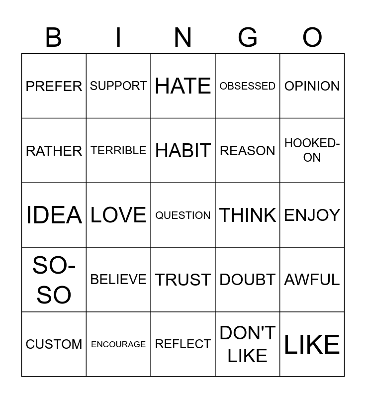 This bingo card has a free space and 24 words: BELIEVE, ENCOURAGE, HABIT, CUSTOM, OPINION, PREFER, RATHER, SUPPORT, THINK, TRUST, REASON, IDEA, DOUBT, AWFUL, TERRIBLE, DON'T LIKE, ENJOY, HATE, HOOKED-ON, LOVE, LIKE, SO-SO, OBSESSED and REFLECT.