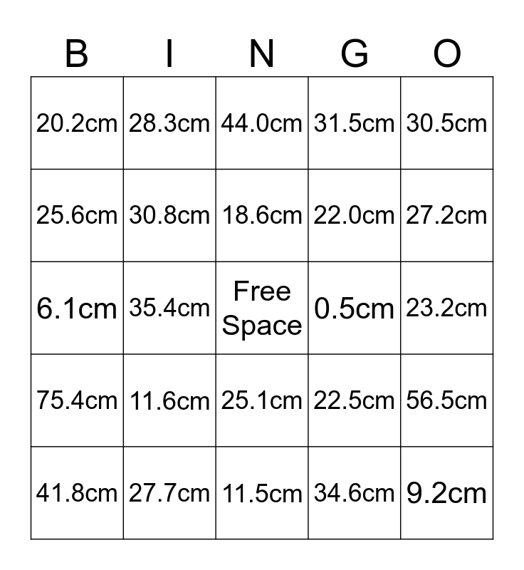 This bingo card has a free space and 24 words: 11.6cm, 27.7cm, 18.6cm, 41.8cm, 30.5cm, 20.2cm, 25.6cm, 28.3cm, 0.5cm, 25.1cm, 22.0cm, 6.1cm, 22.5cm, 56.5cm, 30.8cm, 34.6cm, 23.2cm, 44.0cm, 27.2cm, 35.4cm, 9.2cm, 75.4cm, 31.5cm and 11.5cm.