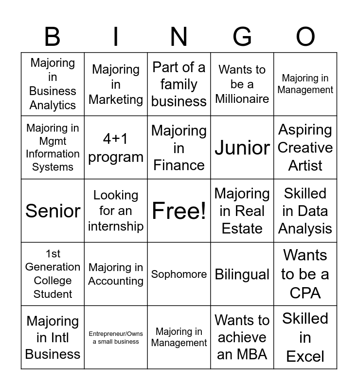 This bingo card has a free space and 25 words: Majoring in Accounting, Majoring in Management, Majoring in Finance, Majoring in Intl Business, Majoring in Management, Majoring in Business Analytics, Majoring in Mgmt Information Systems, Majoring in Marketing, Majoring in Real Estate, Sophomore, Junior, Senior, Bilingual, Wants to be a CPA, 4+1 program, Passion is Real Estate, Skilled in Data Analysis, Part of a family business, Aspiring Creative Artist, Looking for an internship, Skilled in Excel, Entrepreneur/Owns a small business, 1st Generation College Student, Wants to be a Millionaire and Wants to achieve an MBA.