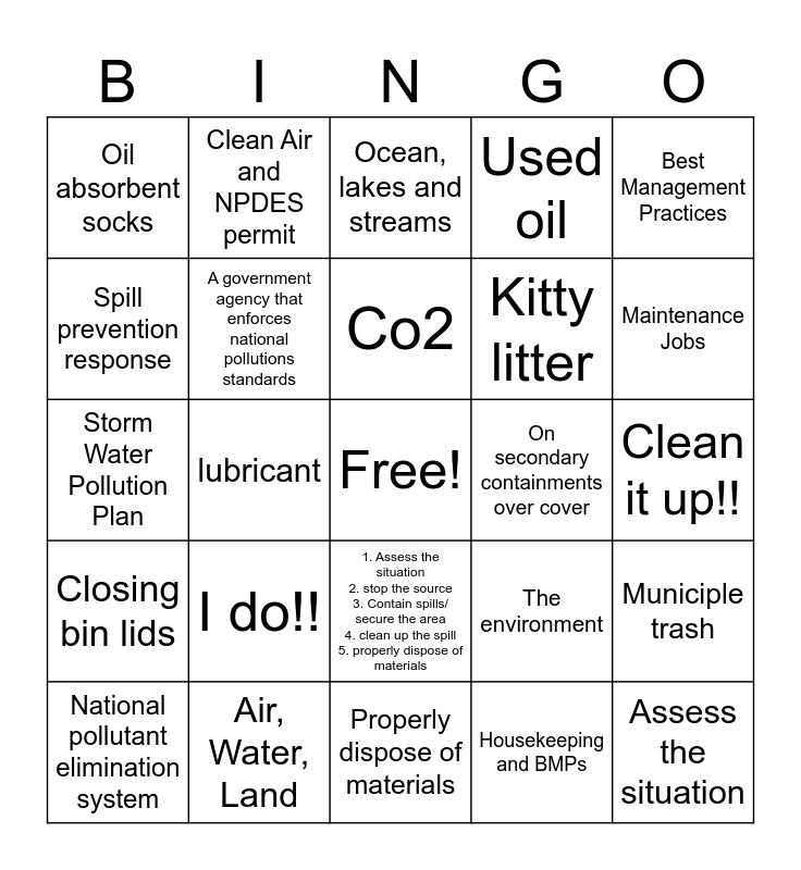 This bingo card has a free space and 29 words: National pollutant elimination system, speed limit, lubricant, proper labeling, Oil absorbent socks, Ocean, lakes and streams, A government agency that enforces national pollutions standards, I do!!, On secondary containments over cover, Air, Water, Land, Clean it up!!, Assess the situation, Properly dispose of materials, Housekeeping and BMPs, Maintenance Jobs, Paved surfaces, 1. Assess the situation 2. stop the source 3. Contain spills/ secure the area 4. clean up the spill 5. properly dispose of materials, Closing bin lids, Best Management Practices, Storm Water Pollution Plan, The environment, Air, Water and land, Kitty litter, Spill prevention response, Used oil, Clean Air and NPDES permit, Municiple trash, Co2 and -Hawaiian Cement -Department of health -EPA.