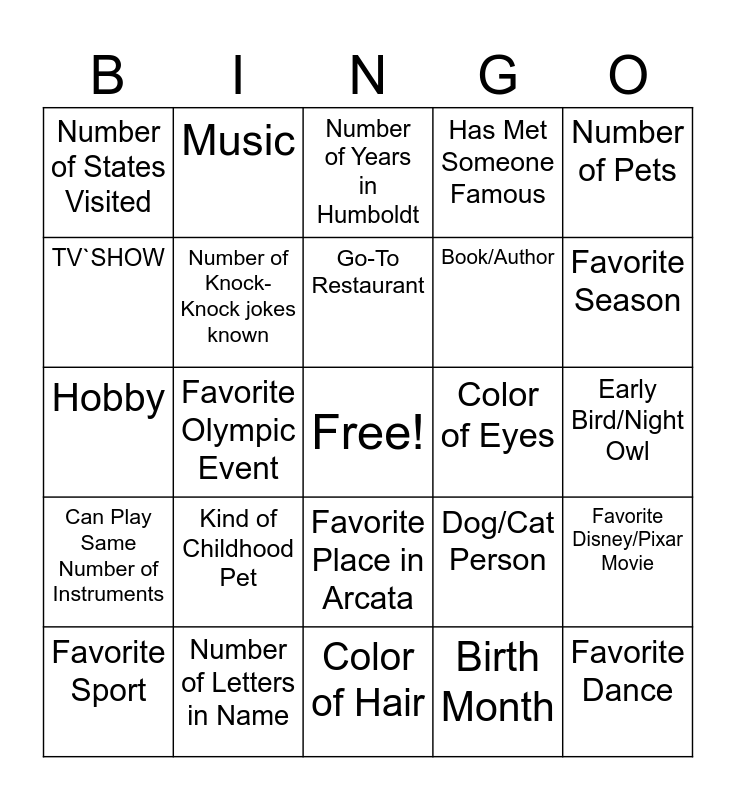 This bingo card has a free space and 26 words: Favorite Place in Arcata, Birth Month, Go-To Restaurant, Number of Letters in Name, Number of Pets, Number of States Visited, TV`SHOW, Music, Early Bird/Night Owl, Dog/Cat Person, Book/Author, Hobby, Favorite Disney/Pixar Movie, Favorite Sport, Favorite Olympic Event, Number of Languages Spoken, Has Met Someone Famous, Can Play Same Number of Instruments, Number of Years in Humboldt, Favorite Dance, Favorite Season, Color of Hair, Color of Eyes, Kind of Childhood Pet, Number of Knock-Knock jokes known and Vacation vs. Staycation.
