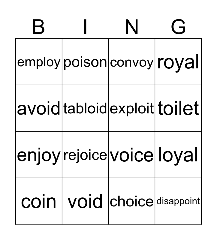 This bingo card has a free space and 15 words: coin, disappoint, convoy, employ, toilet, avoid, rejoice, choice, tabloid, enjoy, loyal, royal, exploit, poison and void.