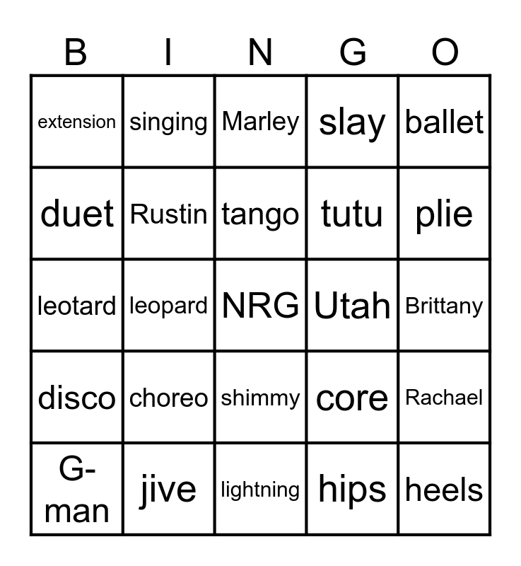 This bingo card has a free space and 106 words: Bourree, Hip Hop, ballet, Get Some, Jazz, Musical Theatre, Disney, Tap, prodigy, national prodigy, juniors, minis, lil sparks, teens, seniors, faculty, Marley, lights, music, beat, shimmy, leap, Jazz square, ballroom, foxtrot, choreo, plie, slay, full out, turns, core, hips, back, isolations, rhythm, battement, step, barre, tango, waltz, boogie, chasse, conga, disco, pop stars, duet, trio, extension, flamenco, heels, hula, jive, kick, Lindy hop, contemporary, lyrical, phrase, musicality, dynamics, singing, dance, finals, competition,, classes, travel, costumes, makeup, hairspray, tutu, leotard, leopard, lightning, merchandise, Atlanta, Birmingham, orlando, Myrtle Beach, Washington DC, Cleveland, Omaha, Provo, Denver, Seattle, Chicago, Phoenix, Layton, Utah, Florida, pointe shoes, Swayze, Mallauri, Todd, Curt, Rustin, Hailee, Rachael, Ashley, Katie, Lonni, Brittany, Rustin, Ava, Lacey, Jenn, G-man and NRG Games.
