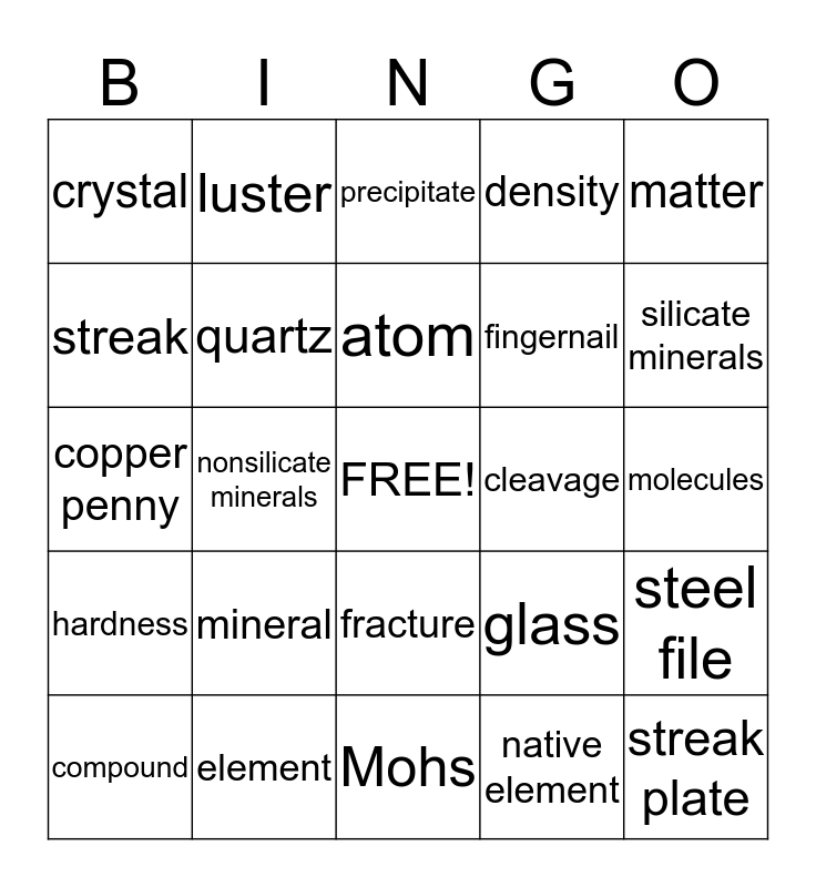 This bingo card has a free space and 24 words: mineral, element, atom, compound, matter, crystal, streak, luster, cleavage, fracture, fingernail, copper penny, glass, steel file, quartz, native element, molecules, precipitate, silicate minerals, nonsilicate minerals, streak plate, hardness, density and Mohs.