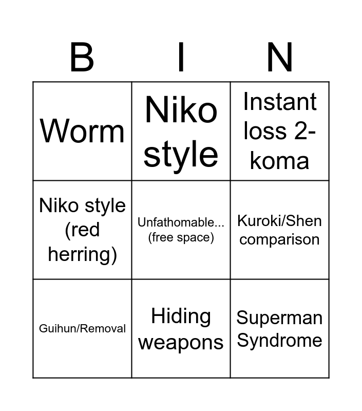 This bingo card has a free space and 8 words: Kuroki/Shen comparison, Instant loss 2-koma, Niko style, Guihun/Removal, Worm, Superman Syndrome, Niko style (red herring) and Hiding weapons.