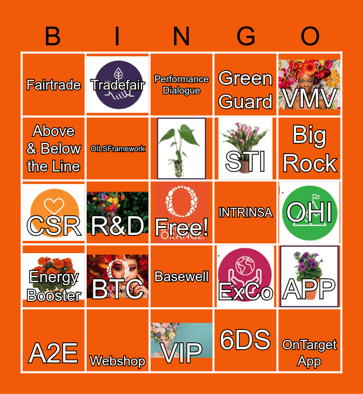 This bingo card has 12 images, a free space and 23 words: BTC, Webshop, A2E, VMV, Fairtrade, Above & Below the Line, Tradefair, INTRINSA, Basewell, STI, CSR, ExCo, APP, OILSFramework, 6DS, OHI, Performance Dialogue, Big Rock, R&D, OnTarget App, Energy Booster, Green Guard and VIP.