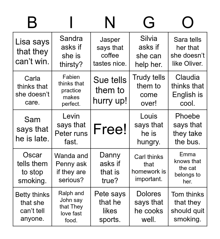 This bingo card has a free space and 24 words: Wanda and Penny ask if they are serious?, Ralph and John say that They love fast food., Sue tells them to hurry up!, Betty thinks that she can’t tell anyone., Sara tells her that she doesn’t like Oliver., Lisa says that they can’t win., Carla thinks that she doesn’t care., Sandra asks if she is thirsty?, Louis says that he is hungry., Danny asks if that is true?, Trudy tells them to come over!, Sam says that he is late., Carl thinks that homework is important., Emma knows that the cat belongs to her., Fabien thinks that practice makes perfect., Dolores says that he cooks well., Phoebe says that they take the bus., Jasper says that coffee tastes nice., Claudia thinks that English is cool., Levin says that Peter runs fast., Tom thinks that they should quit smoking., Oscar tells them to stop smoking., Silvia asks if she can help her. and Pete says that he likes sports..