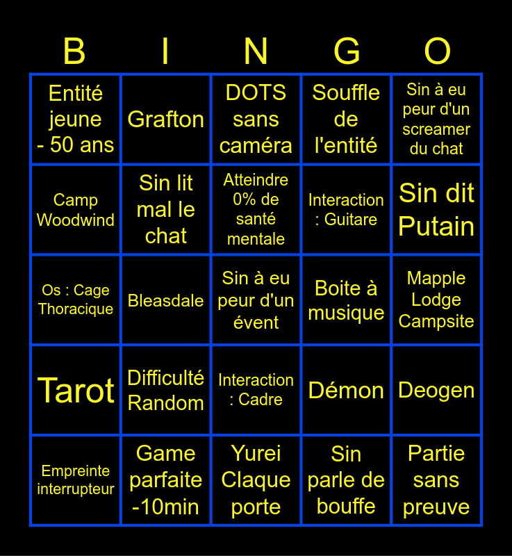 This bingo card has 145 words: Banshee, Mimic, Cauchemar, Myling, Djinn, Démon, Obake, Ombre, Oni, Onryo, Esprit, Poltergeist, Fantôme, Raiju, Revenant, Goryo, Spectre, Hantu, Jumeaux, Yokai, Yurei, Deogen, Moroi, Thaye, Asile, Bleasdale, Grafton, High School, Tanglewood, Ridgeview, Prison, Edgefield, Willow, Mapple Lodge Campsite, Entité cave ou grenier, Entité dans la cuisine, Entité dans une chambre, Interaction : Rocking Chair, Interaction : Guitare, Interaction : Piano, Interaction : Ballon, Interaction : Chaussure, Interaction : Cadre, Météo : Aube, Interaction : Téléphone, Interaction : Télévision, Interaction : Peluche, Interaction : Douche, Eau Sale, Interaction : Ventilateur, Interaction : Voiture, Empreinte fenêtre, Empreinte interrupteur, Entité Coupe Courant, Event : Lumière rouge, Event : Explose lumière, Skin : Entité nue, Skin : Sadako, Skin entité : enfant, Skin : Entité rampante, DOTS sans caméra, Partie sans preuve, 80 Dollars photos, Rire fantôme, Miroir, Boite à musique, Tarot, Tarot : Haute prêtresse, Tarot : Pendu, Pentacle, Poupée Voodoo, Ouija, Entité jeune - 50 ans, Entité vieille + 50 ans, Météo : Neige, Dessin livre, Cri banshee, Pleur fantôme, Empreinte 6 Doigts, Souffle de l'entité, Photo fantôme 3 étoiles, Interaction : Radio, Interaction : fenêtre, Os : Crâne, Os : Mâchoire, Os : Bassin, Os : Os Long, Interaction : Éteint lumière, Skin Entité : boucher, Yurei Claque porte, Mannequin téléporté, Os : main, Os : Pied, Os : Colonne vertébrale, Game parfaite -10min, Game 100% -5 min, Souffle Deogen, Pouvoir Polter, Os : Cage Thoracique, Interaction : Allume lumière, Quelqu'un prend un TimeOut dans le chat, Camp Woodwind, Sunny Meadow, Sunny Meadow Restricted, Crucifix retourné sur Sunny Meadow, Atteindre 0% de santé mentale, Entité change de skin, Patte de singe, Souffle bougie, Cri Deogen, Entité dans la salle de bain, Difficulté Random, Sin insulte une maman, Sin dit Putain, Sin chante une chanson de m*rde, Sin à eu peur d'un évent, Sin à eu peur d'un screamer du chat, Sin à rigolé après un screamer du chat, Sin perd son matériel, Sin oublie de cocher un truc, Le chat envoi un screamer, Le chat envoi un prout, Sin foire une photo et râle, Sin dit qu'il n'y a pas d'entité, Sin parle de bouffe, Sin dit "Solide sur les appuis", Sin insulte l'entité, Sin insulte quelqu'un dans le chat, Sin survie on ne sait pas comment, Sin meurt bêtement, Sin cri pour X raison, Une blague de papa passe dans le chat, Ho, un nouveau follow !, Quelqu'un sort une info chat, Sin dit avoir la flemme, Ho, un nouveau sub !, Ho, un son sound alert !, Ça râle sur le dev Phasmo, Sin dit "Hé Poupougne !", Sin bafouille, Sin lit mal le chat, Sin dit "Pas l'temps d'niaiser", Sin râle sur la spirit box, Sin danse and Sin dit "Let's Go".