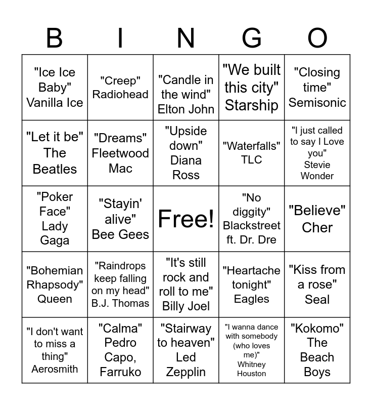 This bingo card has a free space and 24 words: "Raindrops keep falling on my head" B.J. Thomas, "Calma" Pedro Capo, Farruko, "Upside down" Diana Ross, "I don't want to miss a thing" Aerosmith, "Closing time" Semisonic, "Ice Ice Baby" Vanilla Ice, "Let it be" The Beatles, "Creep" Radiohead, "No diggity" Blackstreet ft. Dr. Dre, "It's still rock and roll to me" Billy Joel, "Waterfalls" TLC, "Poker Face" Lady Gaga, "Heartache tonight" Eagles, "Kiss from a rose" Seal, "Dreams" Fleetwood Mac, "I wanna dance with somebody (who loves me)" Whitney Houston, "Believe" Cher, "Candle in the wind" Elton John, "I just called to say I Love you" Stevie Wonder, "Stayin' alive" Bee Gees, "Kokomo" The Beach Boys, "Bohemian Rhapsody" Queen, "We built this city" Starship and "Stairway to heaven" Led Zepplin.