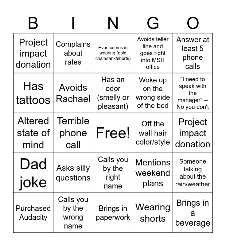 This bingo card has a free space and 24 words: Asks silly questions, Calls you by the wrong name, Has an odor (smelly or pleasant), Purchased Audacity, Answer at least 5 phone calls, Project impact donation, Has tattoos, Complains about rates, Off the wall hair color/style, Calls you by the right name, Woke up on the wrong side of the bed, Altered state of mind, Mentions weekend plans, Someone talking about the rain/weather, Avoids Rachael, Wearing shorts, Project impact donation, Evan comes in wearing (gold chain/tank/shorts), "I need to speak with the manager" --No you don't, Terrible phone call, Brings in a beverage, Dad joke, Avoids teller line and goes right into MSR office and Brings in paperwork.