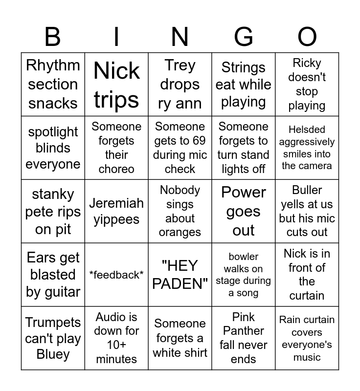 This bingo card has a free space and 29 words: Trumpets can't play Bluey, Maycie thanks the pit for their work, Jeremiah yippees, Gabe squeaks, Rhythm section snacks, Trey drops ry ann, Someone forgets their choreo, *feedback*, Power goes out, Audio is down for 10+ minutes, Buller yells at us but his mic cuts out, Rain curtain covers everyone's music, Someone forgets a white shirt, Pink Panther fall never ends, Helsded aggressively smiles into the camera, out of tune woodwinds, "HEY PADEN", Ears get blasted by guitar, Ricky doesn't stop playing, stanky pete rips on pit, bowler walks on stage during a song, "Can you hear me now?"..."How about now?", Someone forgets to turn stand lights off, spotlight blinds everyone, Strings eat while playing, Nick trips, Nick is in front of the curtain, Someone gets to 69 during mic check and Oliver talks into mic.