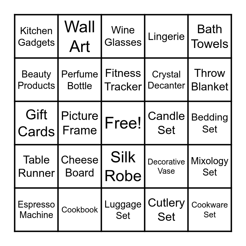 This bingo card has a free space and 30 words: Cookbook, Spa Set, Picture Frame, Tea Set, Kitchen Gadgets, Wine Glasses, Perfume Bottle, Silk Robe, Candle Set, Luggage Set, Bedding Set, Cookware Set, Cutlery Set, Coffee Maker, Throw Blanket, Jewelry Box, Decorative Vase, Table Runner, Cheese Board, Bath Towels, Gift Cards, Baking Pans, Wall Art, Crystal Decanter, Beauty Products, Lingerie, Mixology Set, Espresso Machine, Fitness Tracker and Slow Cooker.