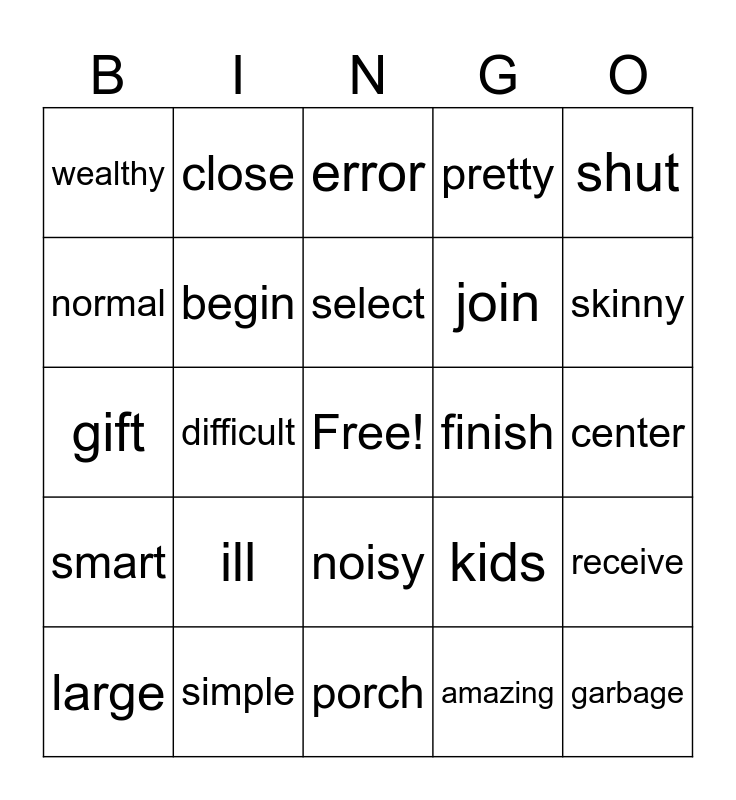 This bingo card has a free space and 29 words: large, tiny, difficult, unhappy, wealthy, error, begin, ill, finish, simple, center, garbage, porch, amazing, skinny, forever, noisy, smart, shut, gift, kids, fake, join, normal, pretty, close, receive, select and strong.