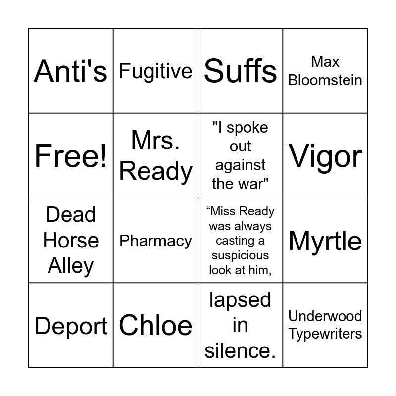 This bingo card has 16 words: Chloe, Myrtle, Suffs, Anti's, Dead Horse Alley, Fugitive, “Miss Ready was always casting a suspicious look at him,, lapsed in silence., Free!, Mrs. Ready, Deport, Max Bloomstein, Pharmacy, Vigor, "I spoke out against the war" and Underwood Typewriters.