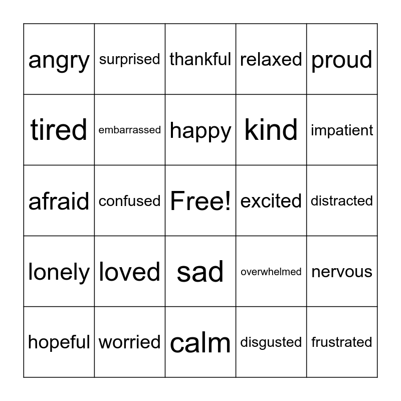 This bingo card has a free space and 24 words: loved, worried, happy, hopeful, proud, angry, tired, surprised, excited, sad, kind, afraid, overwhelmed, nervous, embarrassed, disgusted, distracted, thankful, impatient, confused, frustrated, lonely, relaxed and calm.