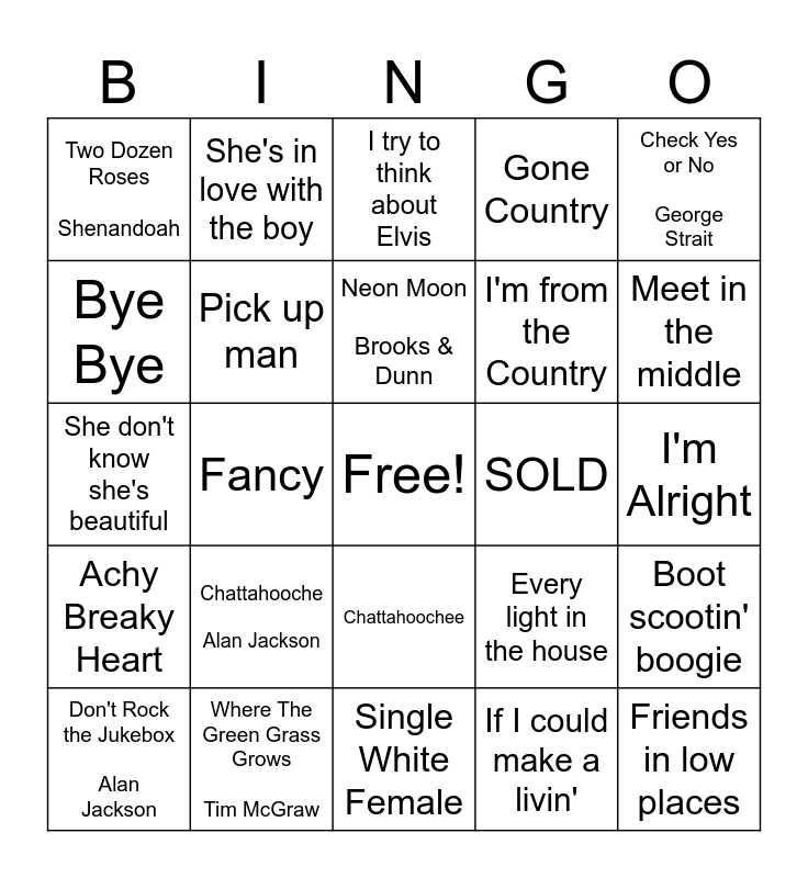 This bingo card has a free space and 24 words: Chattahooche Alan Jackson, Where The Green Grass Grows Tim McGraw, Neon Moon Brooks & Dunn, Don't Rock the Jukebox Alan Jackson, Check Yes or No George Strait, Two Dozen Roses Shenandoah, Bye Bye, She's in love with the boy, SOLD, Chattahoochee, I'm from the Country, She don't know she's beautiful, Every light in the house, Boot scootin' boogie, Pick up man, If I could make a livin', I'm Alright, I try to think about Elvis, Meet in the middle, Fancy, Friends in low places, Achy Breaky Heart, Gone Country and Single White Female.