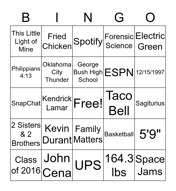 This bingo card has a free space and 24 words: Kevin Durant, John Cena, George Bush High School, Class of 2016, Electric Green, This Little Light of Mine, Philippians 4:13, Fried Chicken, Taco Bell, Family Matters, ESPN, SnapChat, Basketball, 5'9", Oklahoma City Thunder, 164.3 lbs, Sagiturius, Spotify, 12/15/1997, Kendrick Lamar, Space Jams, 2 Sisters & 2 Brothers, Forensic Science and UPS.