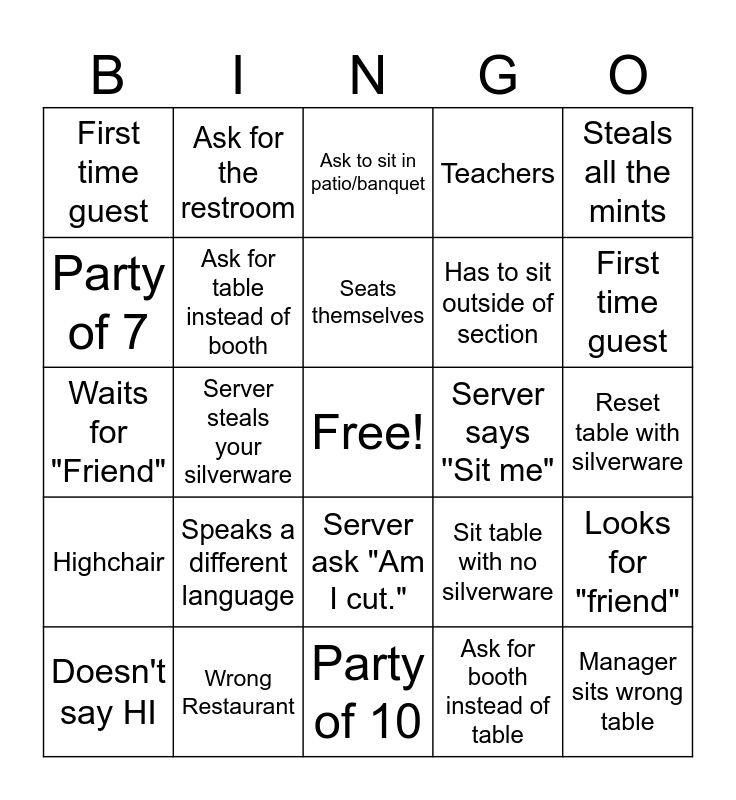 This bingo card has a free space and 24 words: Speaks a different language, Wrong Restaurant, Seats themselves, Doesn't say HI, Steals all the mints, First time guest, Party of 7, Ask for the restroom, Server says ''Sit me", Server ask "Am I cut.", Has to sit outside of section, Waits for "Friend", Sit table with no silverware, Looks for "friend", Ask for table instead of booth, Ask for booth instead of table, Reset table with silverware, Ask to sit in patio/banquet, First time guest, Server steals your silverware, Manager sits wrong table, Highchair, Teachers and Party of 10.