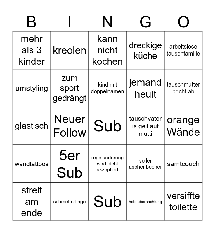 This bingo card has a free space and 24 words: 5er Sub, schmetterlinge, kind mit doppelnamen, streit am ende, arbeitslose tauschfamilie, mehr als 3 kinder, umstyling, kreolen, tauschvater is geil auf mutti, regeländerung wird nicht akzeptiert, jemand heult, glastisch, voller aschenbecher, samtcouch, zum sport gedrängt, hotelübernachtung, orange Wände, kann nicht kochen, tauschmutter bricht ab, Neuer Follow, versiffte toilette, wandtattoos, dreckige küche and Sub.