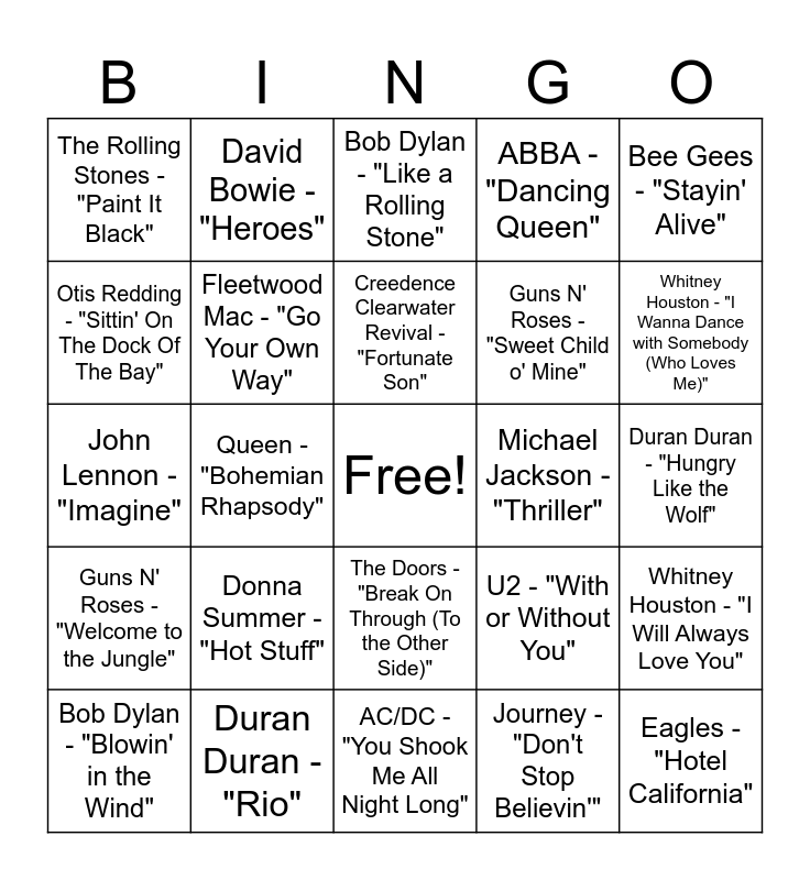 This bingo card has a free space and 75 words: The Beatles - "Hey Jude", The Rolling Stones - "(I Can't Get No) Satisfaction", Bob Dylan - "Like a Rolling Stone", The Beach Boys - "Good Vibrations", Aretha Franklin - "Respect", The Supremes - "You Can't Hurry Love", Marvin Gaye - "I Heard It Through the Grapevine", The Temptations - "My Girl", The Doors - "Light My Fire", Simon & Garfunkel - "Mrs. Robinson", The Animals - "House of the Rising Sun", Jimi Hendrix - "Purple Haze", Creedence Clearwater Revival - "Fortunate Son", Otis Redding - "Sittin' On The Dock Of The Bay", Elvis Presley - "Suspicious Minds", Queen - "Bohemian Rhapsody", Led Zeppelin - "Stairway to Heaven", Eagles - "Hotel California", Pink Floyd - "Another Brick in the Wall, Part 2", Bee Gees - "Stayin' Alive", Elton John - "Rocket Man", John Lennon - "Imagine", Fleetwood Mac - "Go Your Own Way", David Bowie - "Heroes", ABBA - "Dancing Queen", The Rolling Stones - "Miss You", Donna Summer - "I Feel Love", Stevie Wonder - "Superstition", The Clash - "London Calling", Bob Marley & The Wailers - "No Woman, No Cry", Michael Jackson - "Billie Jean", Prince - "Purple Rain", Madonna - "Like a Virgin", U2 - "With or Without You", Whitney Houston - "I Wanna Dance with Somebody (Who Loves Me)", Guns N' Roses - "Sweet Child o' Mine", Bruce Springsteen - "Born in the U.S.A.", Queen - "Another One Bites the Dust", Duran Duran - "Hungry Like the Wolf", Journey - "Don't Stop Believin'", AC/DC - "Back in Black", The Police - "Every Breath You Take", Bon Jovi - "Livin' On a Prayer", Cyndi Lauper - "Girls Just Want to Have Fun", George Michael - "Careless Whisper", The Beatles - "Let It Be", Bob Dylan - "Blowin' in the Wind", The Rolling Stones - "Paint It Black", The Supremes - "Baby Love", Stevie Wonder - "For Once in My Life", The Temptations - "Ain't Too Proud to Beg", The Doors - "Break On Through (To the Other Side)", Aretha Franklin - "Chain of Fools", Simon & Garfunkel - "The Sound of Silence", Jefferson Airplane - "Somebody to Love", Elton John - "Your Song", David Bowie - "Starman", Pink Floyd - "Wish You Were Here", Led Zeppelin - "Whole Lotta Love", Queen - "We Will Rock You", Donna Summer - "Hot Stuff", Bee Gees - "How Deep Is Your Love", Fleetwood Mac - "Dreams", Eagles - "Take It Easy", ABBA - "Waterloo", Michael Jackson - "Thriller", Prince - "When Doves Cry", Madonna - "Material Girl", U2 - "Pride (In the Name of Love)", Whitney Houston - "I Will Always Love You", Guns N' Roses - "Welcome to the Jungle", Duran Duran - "Rio", Bruce Springsteen - "Dancing in the Dark", AC/DC - "You Shook Me All Night Long" and Billy Joel - "Piano Man".