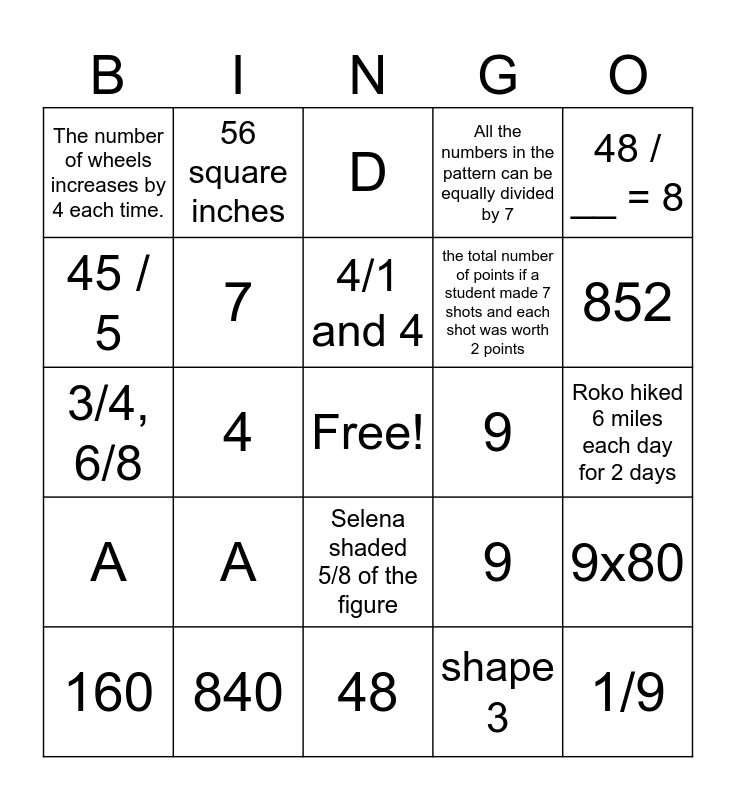 This bingo card has a free space and 24 words: A, 840, 4/1 and 4, 160, 48 / __ = 8, The number of wheels increases by 4 each time., 45 / 5, 56 square inches, 9, Selena shaded 5/8 of the figure, the total number of points if a student made 7 shots and each shot was worth 2 points, 3/4, 6/8, 9, 9x80, 7, shape 3, Roko hiked 6 miles each day for 2 days, D, 852, 4, 1/9, A, All the numbers in the pattern can be equally divided by 7 and 48.