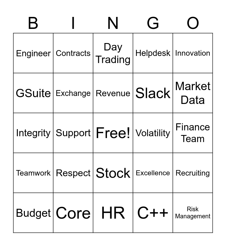 This bingo card has a free space and 30 words: Core, Trading, Support, Code, Engineer, Day Trading, Exchange, Stock, Volatility, HR, Finance Team, Risk Management, C++, Information Security, Market Data, Global Company, Excellence, Teamwork, Respect, Innovation, Integrity, Real Estate, Contracts, Slack, GSuite, Helpdesk, Recruiting, Budget, Revenue and Company Culture.