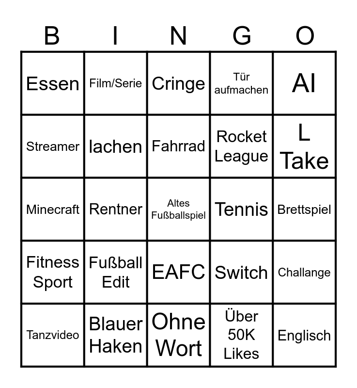 This bingo card has a free space and 24 words: Fußball Edit, Blauer Haken, Fahrrad, Tanzvideo, AI, Essen, Streamer, Film/Serie, Tennis, EAFC, Rocket League, Minecraft, Switch, Challange, lachen, Über 50K Likes, Brettspiel, Cringe, L Take, Rentner, Englisch, Fitness Sport, Tür aufmachen and Ohne Wort.