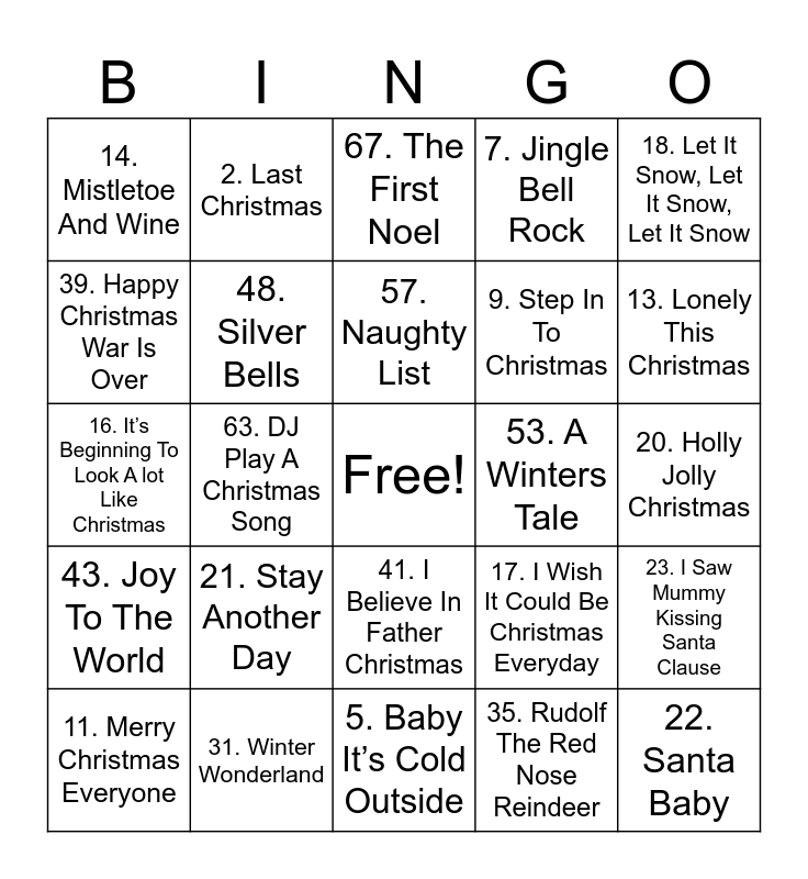 This bingo card has a free space and 71 words: 1. Do They Know It’s Christmas, 2. Last Christmas, 3. All I Want For Christmas Is You, 4. Fairytale Of New York, 5. Baby It’s Cold Outside, 6. White Christmas, 7. Jingle Bell Rock, 8. Wonderful Christmas Time, 9. Step In To Christmas, 10. Driving Home For Christmas, 11. Merry Christmas Everyone, 12. Rocking Around The Christmas Tree, 13. Lonely This Christmas, 14. Mistletoe And Wine, 15. It’s The Most Wonderful Time Of The Year, 16. It’s Beginning To Look A lot Like Christmas, 17. I Wish It Could Be Christmas Everyday, 18. Let It Snow, Let It Snow, Let It Snow, 19. Santa Clause Is Coming To Town, 20. Holly Jolly Christmas, 21. Stay Another Day, 22. Santa Baby, 23. I Saw Mummy Kissing Santa Clause, 24. Blue Christmas, 25. Christmas Wrapping, 26. Deck The Halls, 27. Stop The Cavalry, 28. Thank God It’s Christmas, 29. 2000 Miles, 30. Silent Night, 31. Winter Wonderland, 32. 12 Days Of Christmas, 33. Frosty The Snowman, 34. Here Comes Santa Clause, 35. Rudolf The Red Nose Reindeer, 36. Feliz Navidad, 37. The Little Drummer Boy, 38. Run Rudolf Run, 39. Happy Christmas War Is Over, 40. Sleigh Ride, 41. I Believe In Father Christmas, 42. Little Saint Nick, 43. Joy To The World, 44. O Holy Night, 45. Walking In The Air, 46. Once In Royal David’s City, 47. The Holly And The Ivy, 48. Silver Bells, 49. Warm December, 50. Happy Holiday, 51. Christmas Lights, 52. Pretty Paper, 53. A Winters Tale, 54. One More Sleep, 55. Home For The Holidays, 56. Santa Tell Me, 57. Naughty List, 58. Like It’s Christmas, 59. Come On Home For Christmas, 60. You’re Christmas To Me, 61. Santas Coming For Us, 62. When Christmas Comes Around, 63. DJ Play A Christmas Song, 64. Underneath The Tree, 65. Mary’s Boy Child, 66. Away In A Manger, 67. The First Noel, 68. Peace On Earth, 69. The Christmas Walt’s, 70. A Wombling Merry Christmas and 71. Sausage Rolls For Everyone.
