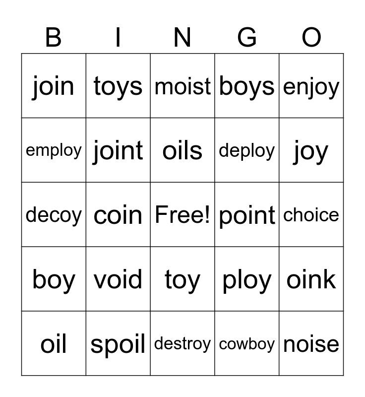 This bingo card has a free space and 29 words: oil, boil, coin, foil, join, moist, joint, void, point, spoil, choice, noise, destroy, cowboy, joy, soy, toy, boy, enjoy, decoy, ploy, annoy, deploy, employ, boys, toys, oink, oils and spoils.