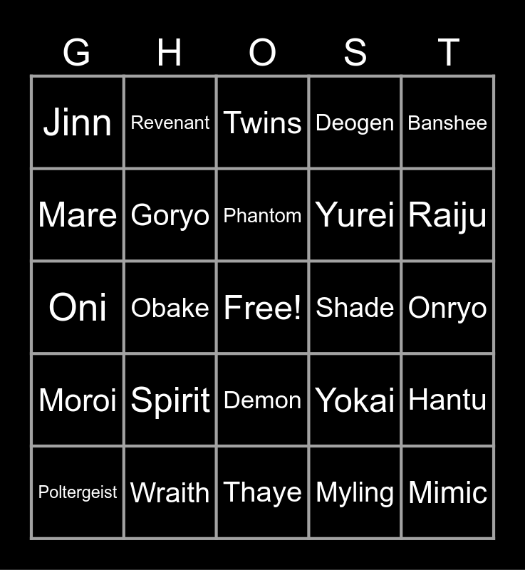 This bingo card has a free space and 24 words: Spirit, Wraith, Phantom, Poltergeist, Banshee, Jinn, Mare, Revenant, Shade, Demon, Yurei, Oni, Yokai, Hantu, Goryo, Myling, Onryo, Twins, Raiju, Obake, Mimic, Moroi, Deogen and Thaye.