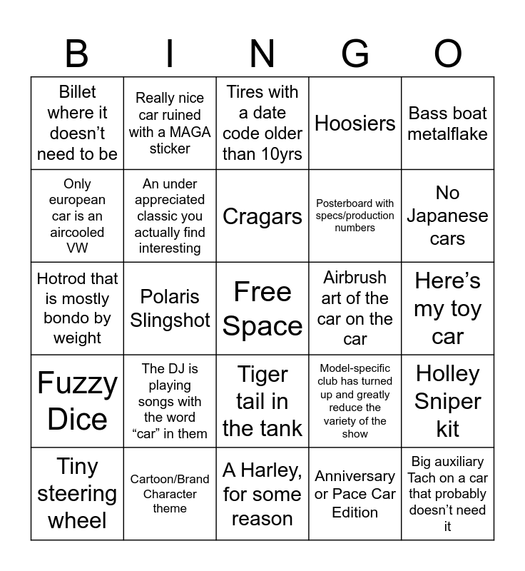 This bingo card has a free space and 24 words: The DJ is playing songs with the word “car” in them, Cartoon/Brand Character theme, Cragars, Tiny steering wheel, Bass boat metalflake, Billet where it doesn’t need to be, Only european car is an aircooled VW, Really nice car ruined with a MAGA sticker, Airbrush art of the car on the car, Tiger tail in the tank, Posterboard with specs/production numbers, Hotrod that is mostly bondo by weight, Model-specific club has turned up and greatly reduce the variety of the show, Holley Sniper kit, An under appreciated classic you actually find interesting, Anniversary or Pace Car Edition, Here’s my toy car, Tires with a date code older than 10yrs, No Japanese cars, Polaris Slingshot, Big auxiliary Tach on a car that probably doesn’t need it, Fuzzy Dice, Hoosiers and A Harley, for some reason.