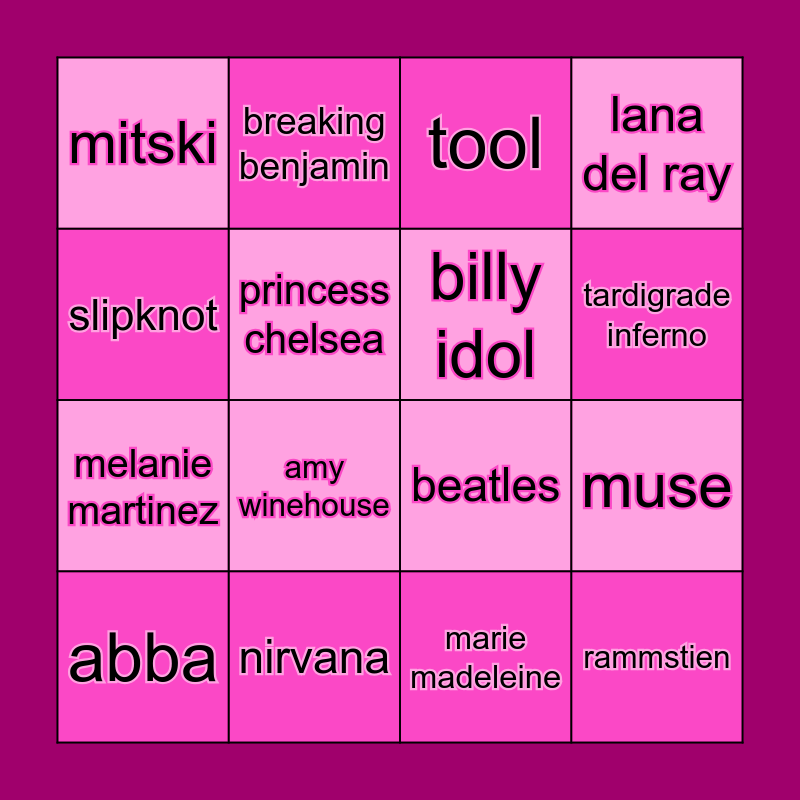 This bingo card has 16 words: nirvana, muse, tool, mitski, melanie martinez, breaking benjamin, beatles, marie madeleine, slipknot, princess chelsea, abba, lana del ray, amy winehouse, tardigrade inferno, billy idol and rammstien.