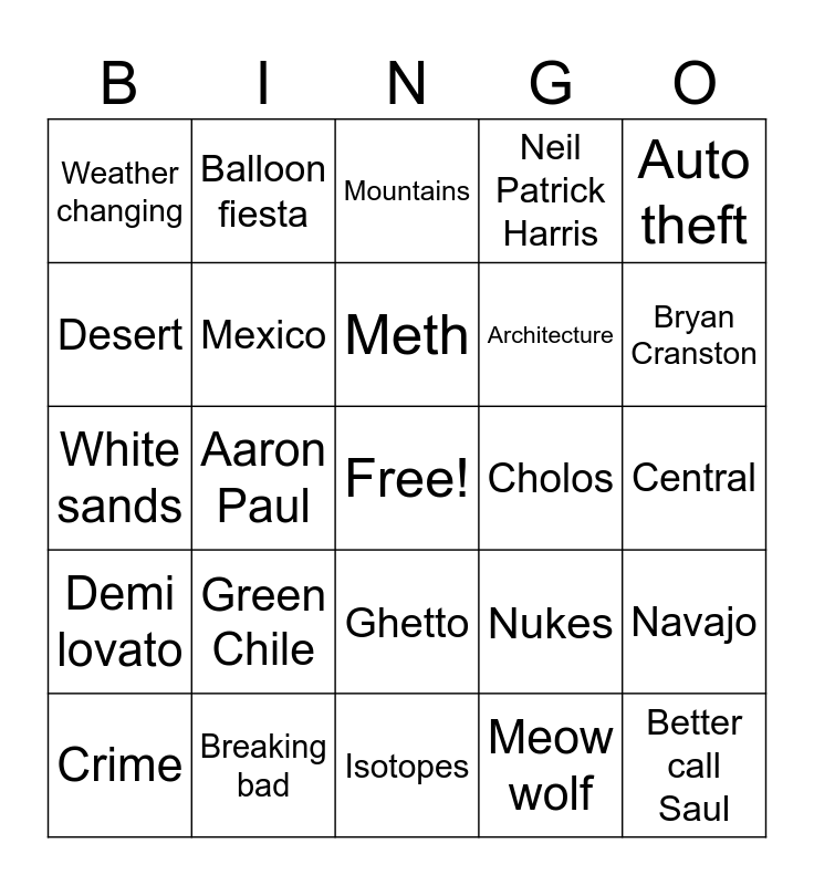 This bingo card has a free space and 24 words: Green Chile, Breaking bad, Meth, Crime, Auto theft, Weather changing, Desert, Balloon fiesta, Cholos, Ghetto, Architecture, White sands, Nukes, Navajo, Mexico, Meow wolf, Central, Mountains, Bryan Cranston, Aaron Paul, Better call Saul, Demi lovato, Neil Patrick Harris and Isotopes.