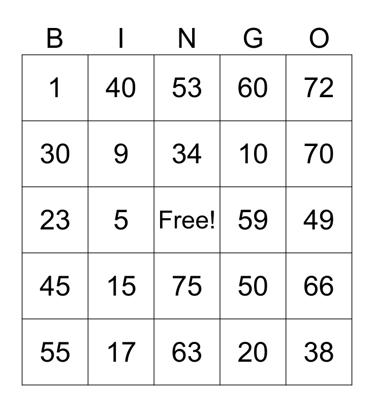 This bingo card has a free space and 24 words: 15, 17, 34, 55, 72, 1, 30, 40, 59, 75, 10, 23, 50, 66, 9, 20, 49, 53, 70, 5, 38, 45, 60 and 63.
