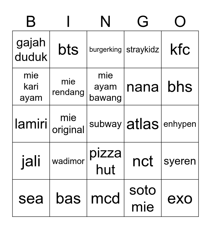 This bingo card has a free space and 24 words: sea, wadimor, mie ayam bawang, soto mie, kfc, gajah duduk, bts, burgerking, atlas, enhypen, lamiri, mie rendang, nct, syeren, mie kari ayam, bas, mcd, straykidz, bhs, jali, mie original, pizza hut, nana and exo.