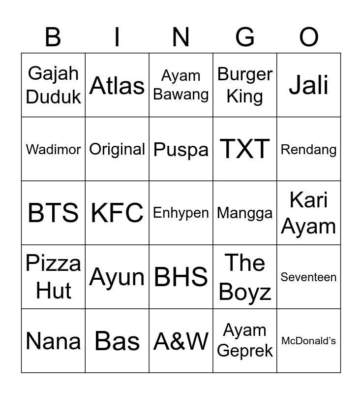 This bingo card has a free space and 24 words: Ayun, Bas, Puspa, Nana, Jali, Gajah Duduk, Wadimor, Atlas, Mangga, BHS, TXT, BTS, The Boyz, Seventeen, Original, Ayam Geprek, Kari Ayam, Ayam Bawang, Rendang, KFC, McDonald’s, Pizza Hut, Burger King and A&W.