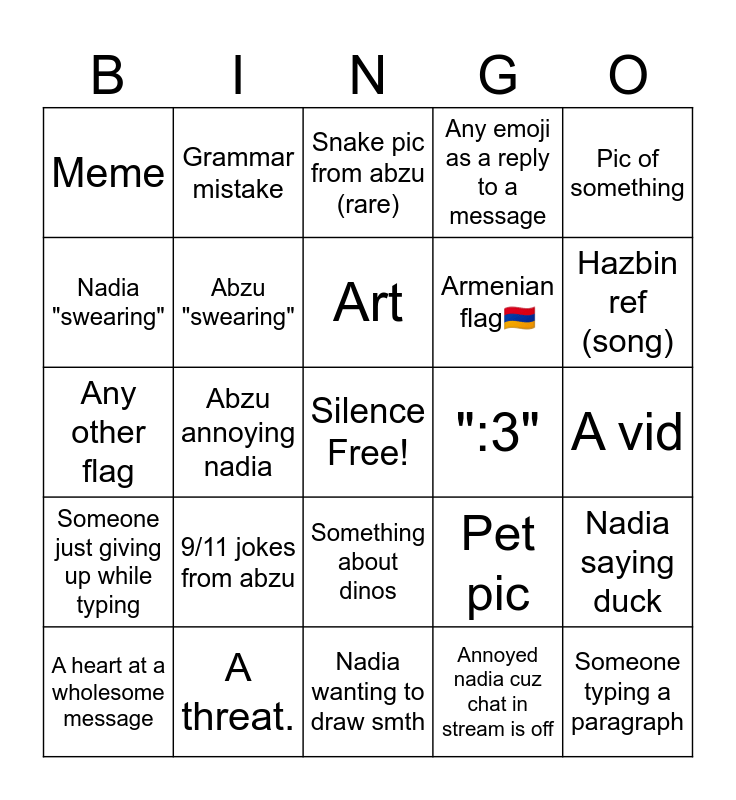 This bingo card has a free space and 24 words: 9/11 jokes from abzu, A threat., Art, A heart at a wholesome message, Pic of something, Meme, Nadia "swearing", Grammar mistake, ":3", Something about dinos, Armenian flag🇦🇲, Any other flag, Pet pic, Nadia saying duck, Abzu "swearing", Annoyed nadia cuz chat in stream is off, A vid, Snake pic from abzu (rare), Hazbin ref (song), Abzu annoying nadia, Someone typing a paragraph, Someone just giving up while typing, Any emoji as a reply to a message and Nadia wanting to draw smth.