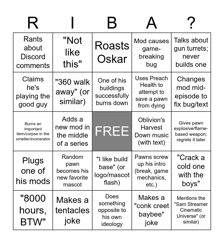 This bingo card has a free space and 39 words: Recreates a meme that you know took at least 1-2 hours to edit, "You will never get this", "Boil and die", "360 walk away" (or similar), "8000 hours, BTW", "I like build base" (or logo/mascot flash), One of his buildings successfully burns down, Talks about fireform poppers; never builds one, Talks about gun turrets; never builds one, Plugs one of his mods, Adds a new mod in the middle of a series, Mod causes game-breaking bug, Mentions the "Sam Streamer Cinematic Universe" (or similar), Gives pawn explosive/flame-based weapon; regrets it later, Oblivion's Harvest Down music (with text), Random pawn becomes his new favorite mascot, Rants about YouTube comments, Rants about Discord comments, Rants about "Where's RimRim?" (like we really care about schedules), Pawns screw up his intro (break, game mechanics, etc.), Claims he's playing the good guy, Does something opposite to his own ideology, Uses Preach Health to attempt to save a pawn from dying, Changes mod mid-episode to fix bug/text, Raid almost wipes town and he focuses on defenses, Pawn (almost) dies to friendly fire, Says "Steady" in a Jar-Jar voice, "You big b*tch", "My boys", "Not like this", Overworks pawn to construct/craft something to an extreme break, Runs of out of components/steel; breaks down structure to get some back, Roasts Oskar, Makes a tentacles joke, Makes a "conk creet baybee" joke, Focuses more on meme base than actual defenses, "Crack a cold one with the boys", Burns an important item/corpse in the smelter/incinerator and That spinning video into a weird desktop image bit.