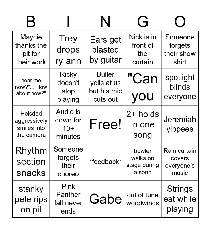 This bingo card has a free space and 31 words: Gabe, squeaks, Audio is down for 10+ minutes, Nick trips, Maycie thanks the pit for their work, Ears get blasted by guitar, Ricky doesn't stop playing, bowler walks on stage during a song, 2+ holds in one song, out of tune woodwinds, Jeremiah yippees, Strings eat while playing, Power goes out, "HEY PADEN", spotlight blinds everyone, Oliver talks into mic, Rain curtain covers everyone's music, Someone forgets their choreo, Rhythm section snacks, *feedback*, Someone forgets their show shirt, Someone gets to 69 during mic check, stanky pete rips on pit, Trey drops ry ann, "Can you, hear me now?"..."How about now?", Nick is in front of the curtain, Helsded aggressively smiles into the camera, Pink Panther fall never ends, Buller yells at us but his mic cuts out and Someone forgets to turn stand lights off.