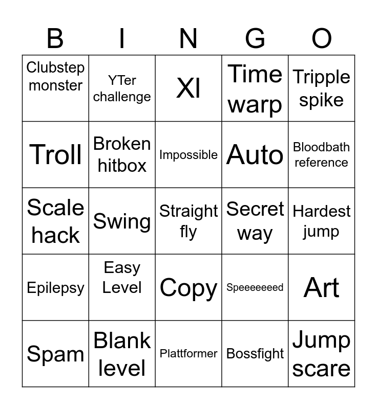 This bingo card has a free space and 24 words: Easy Level, Blank level, Impossible, Spam, Tripple spike, Clubstep monster, Troll, YTer challenge, Secret way, Copy, Auto, Scale hack, Speeeeeeed, Art, Broken hitbox, Bossfight, Hardest jump, Xl, Bloodbath reference, Swing, Jump scare, Epilepsy, Time warp and Plattformer.
