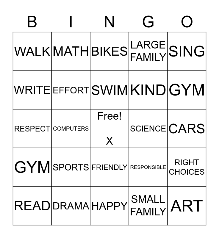This bingo card has a free space and 25 words: SPORTS, HAPPY, SWIM, READ, SING, WALK, WRITE, MATH, SCIENCE, FRIENDLY, KIND, RESPECT, RESPONSIBLE, RIGHT CHOICES, EFFORT, ART, CARS, BIKES, GYM, COMPUTERS, ART, DRAMA, GYM, LARGE FAMILY and SMALL FAMILY.