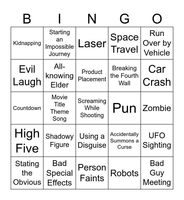 This bingo card has 28 words: UFO Sighting, Dramatic Entrance, Breaking the Fourth Wall, Robots, Evil Laugh, Laser, Starting an Impossible Journey, High Five, Pun, Stating the Obvious, Countdown, Space Travel, Bad Special Effects, Person Faints, Car Crash, Montage, Shadowy Figure, All-knowing Elder, Product Placement, Using a Disguise, Kidnapping, Bad Guy Meeting, Screaming While Shooting, Movie Title Theme Song, Zombie, Accidentally Summons a Curse, Run Over by Vehicle and Graveyard Scene.
