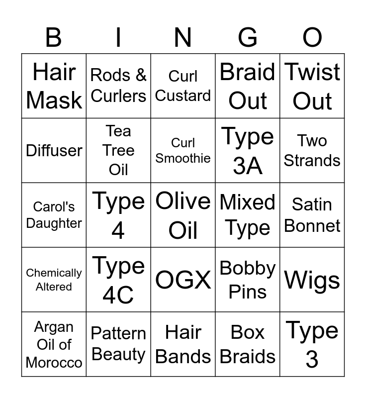 This bingo card has 75 words: Type 1, Blue Magic, Curl Custard, Combs: Wide Tooth & Rat Tail, Bantu Knots, Type 2, Mielle, Curl Activator, Detangling Brush, Senegalese Twists, Type 3, Cantu, Curl Smoothie, Diffuser, Passion Twists, Type 4, Shea Moisture, Olive Oil, Hair Sponge, Twist Out, Type 2A, Carol's Daughter, Tea Tree Oil, Rods & Curlers, Braid Out, Type 2B, Curly Kids, Creams, Edge Groomer Brush, Crochet Styles, Type 2C, Mixed Chicks, Leave In Conditioner, Bobby Pins, Two Strands, Type 3A, Camille Rose Naturals, Deep Conditioner, Satin Bonnet, Box Braids, Type 3B, Mango & Lime, Shampoo, Silk Scarf, Knotless Braids, Type 3C, Argan Oil of Morocco, Hair Mask, Hood Dryer, Cornrows, Type 4A, OGX, Mousse, Afro Pick, Afro, Type 4B, 24 Hr Edge Control, Detangler, Shampoo Brush, Locs, Type 4C, DevaCurl, Protein Treatment, Crochet Needle, Faux Locs, Mixed Type, Kinky-Curly, Scalp Treatment, Needle & Thread, Wigs, Chemically Altered, Pattern Beauty, Gel/Holding Spray, Hair Bands and Weaves.