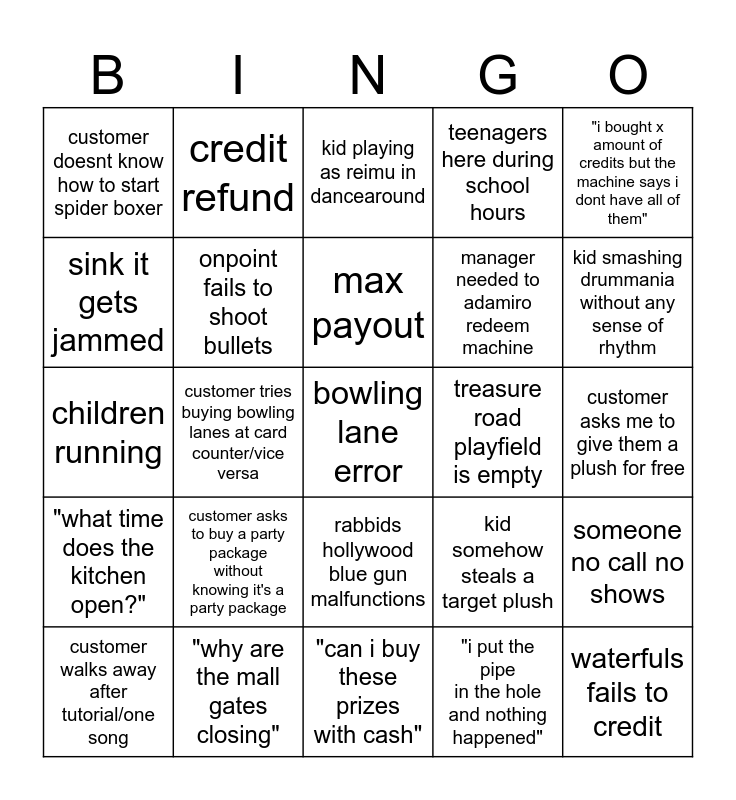 This bingo card has a free space and 24 words: customer asks to buy a party package without knowing it's a party package, "why are the mall gates closing", max payout, customer walks away after tutorial/one song, "i bought x amount of credits but the machine says i dont have all of them", customer doesnt know how to start spider boxer, sink it gets jammed, credit refund, treasure road playfield is empty, rabbids hollywood blue gun malfunctions, manager needed to adamiro redeem machine, children running, kid somehow steals a target plush, someone no call no shows, onpoint fails to shoot bullets, "i put the pipe in the hole and nothing happened", customer asks me to give them a plush for free, kid playing as reimu in dancearound, kid smashing drummania without any sense of rhythm, customer tries buying bowling lanes at card counter/vice versa, waterfuls fails to credit, "what time does the kitchen open?", teenagers here during school hours and "can i buy these prizes with cash".