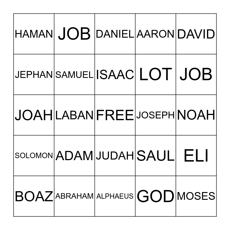 This bingo card has a free space and 24 words: ADAM, ABRAHAM, ISAAC, BOAZ, DAVID, HAMAN, JEPHAN, JOB, JOSEPH, JUDAH, LOT, JOAH, SAUL, ELI, SAMUEL, GOD, NOAH, DANIEL, JOB, LABAN, MOSES, SOLOMON, AARON and ALPHAEUS.