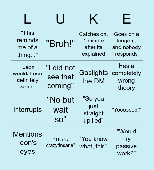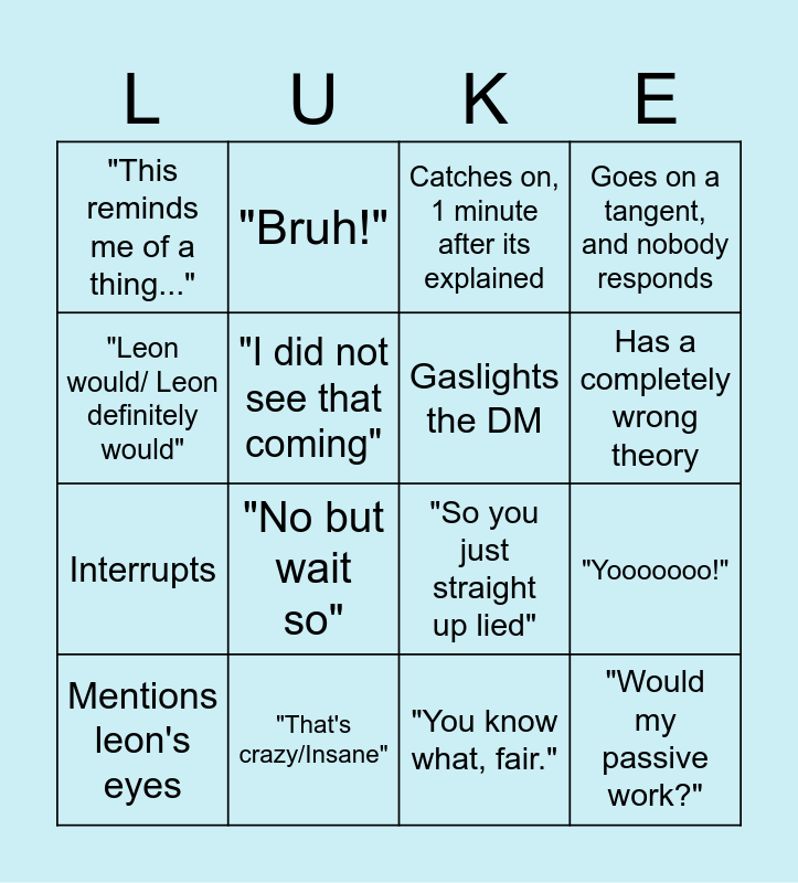 This bingo card has 16 words: "That's crazy/Insane", "Yooooooo!", Catches on, 1 minute after its explained, "This reminds me of a thing...", Interrupts, "Bruh!", "So you just straight up lied", "You know what, fair.", "Leon would/ Leon definitely would", "I did not see that coming", Mentions leon's eyes, Goes on a tangent, and nobody responds, "No but wait so", Has a completely wrong theory, Gaslights the DM and "Would my passive work?".